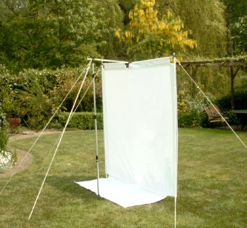 Vanglaken zoals op foto, dus voorzien van tentpalen, dwarslatten, scheerlijnen, haringen. Bovendien is toegevoegd een fitting met beschermkap en 5 meter snoer en tijdelijk weer een ML lamp 160 Watt.